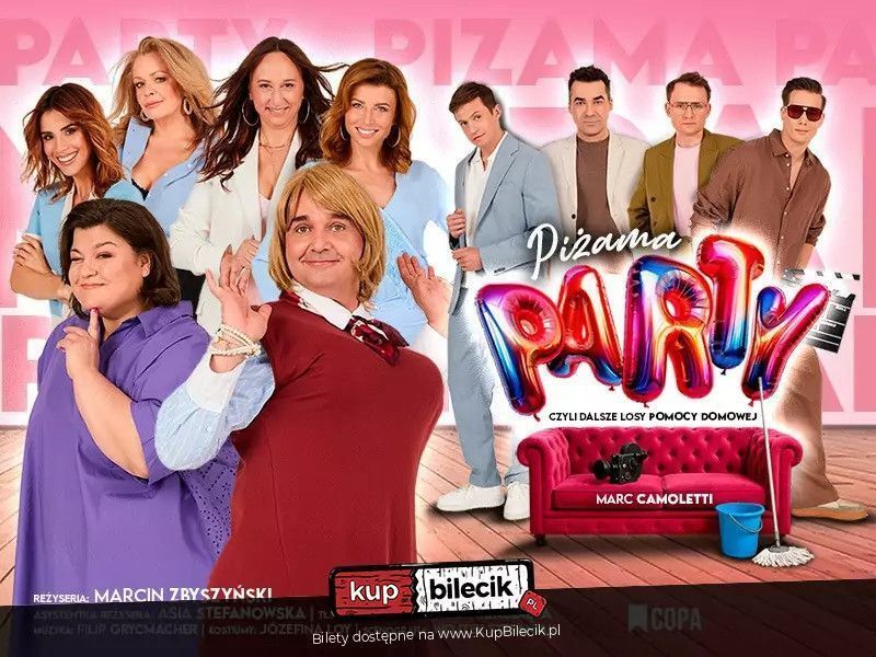 Piżama Party, to wystrzałowa farsa mistrza gatunku Marca Camolettiego w tłumaczeniu Bartosza Wierzbięty (Pomoc Domowa, Boeing Boeing). Kolejna część przygód Nadii - szalonej Pomocy Domowej, która tym razem stanie się... aktorką!