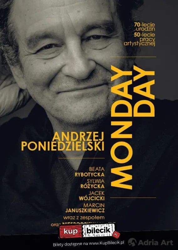 Zapraszamy na niezwykły koncert z okazji 50-lecia pracy artystycznej Andrzeja Poniedzielskiego, zatytułowany "Monday-Day". Wraz z zaproszonymi gośćmi artysta zaprezentuje swoje największe przeboje. Andrzej Poniedzielski, legenda polskiego kabaretu, świętuje 50 lat kariery artystycznej. To nie tylko wybitny satyryk i poeta, ale także autor inteligentnych tekstów piosenek, które od lat bawią i wzruszają publiczność. Podczas koncertu "Monday-Day" będziemy mieli okazję usłyszeć przekrój artystycznej drogi Andrzeja Poniedzielskiego. Do wspólnego świętowania artysta zaprosił wspaniałych wykonawców, takich jak Beata Rybotycka, Sylwia Różycka, Marcin Januszkiewicz i Jacek Wójcicki. Nie zabraknie również niespodziewanych gości. Całość będzie otoczona niepowtarzalną oprawą muzyczną, która zagwarantuje niezapomniane wrażenia, pełne emocji i wzruszeń. Dołącz do nas, aby uczcić pięćdziesiąt lat niezwykłej kariery Andrzeja Poniedzielskiego podczas koncertów "Monday-Day". Sprawdź repertuar i zarezerwuj bilety online.