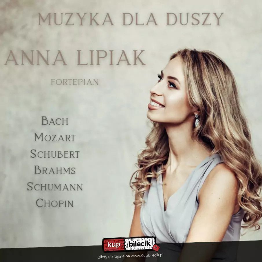 Głęboko uduchowiona pianistka młodego pokolenia Anna Lipiak podczas recitalu fortepianowego zaprezentuje bogaty w emocje program pt. "Muzyka dla duszy". W tytule tym zawarte są ponadczasowe dzieła Jana Sebastiana Bacha - ojca muzyki klasycznej, przeszywająca do głębi, niedokończona Fantazja d-moll W.A.Mozarta, nasuwająca skojarzenia z "Requiem", wzruszające utwory Schuberta napisane w ostatnim roku jego życia, pełne poezji kompozycje Schumanna oraz Brahmsa i dwa arcydzieła Fryderyka Chopina. Podczas koncertu pianistka również podzieli się z publicznością swoją osobistą relacją z wykonywanym programem, co uczyni koncert bardziej intymnym doświadczeniem i pozwoli nawiązać więź z artystką.