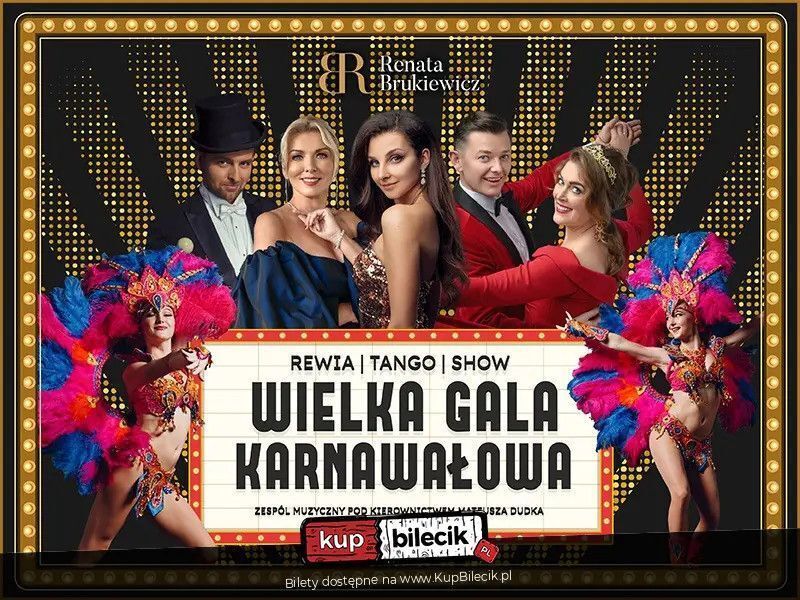 Zapraszamy na niezwykłe widowisko muzyczne, które na zawsze pozostanie w Waszej pamięci! Gala, jakiej jeszcze nie było - prawdziwa uczta dla zmysłów i duszy. Wielka Gala Karnawałowa - Rewia - Tango - Show to koncert, w którym każdy utwór to małe arcydzieło, każde show skrywa niezapomniane emocje, tango opowiada wyjątkową historię, a rewia zachwyca lekkością i tajemniczością. Tego wyjątkowego wieczoru przeniesiemy się w magiczny świat karnawałowych tradycji z najpiękniejszych zakątków globu.
