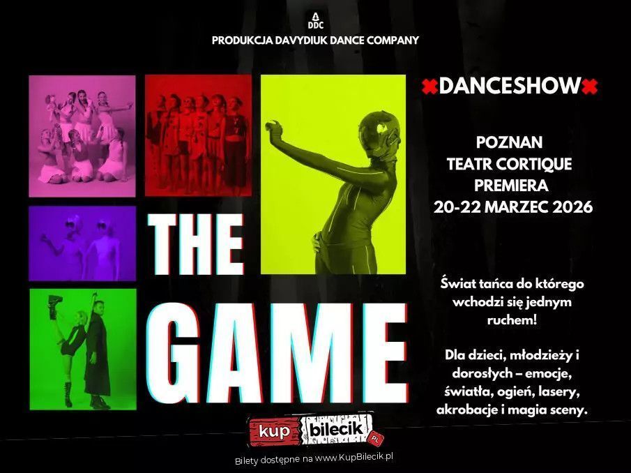 W tym świecie taniec jest językiem, a emocje stają się kodem. Awatary łączą się z ciałami tancerek, tworząc jedność człowieka i technologii. Boty poruszają się w rytmie idealnym, ale bez duszy. Cyber Goth - królowa gry - obserwuje, prowokuje, łamie zasady. A u jej boku stoi Pixel - ogień i kod w jednym, strażnik zasad i doradca, który zna tajemnice systemu. Nikt nie wie, kim naprawdę są. Czy to twórcy gry, jej strażnicy, czy może sama sztuczna inteligencja, która uczy się emocji poprzez taniec? "THE GAME" to rodzinne widowisko taneczne, które łączy różne style tańca - od klasyki po taniec nowoczesny - z akrobacjami, światłem, laserami i ogniem. To spektakl, w którym technologia spotyka się z ciałem, a wirtualność z prawdziwymi uczuciami. Muzyka tworzy pulsujący rytm świata gry - od klasycznych dźwięków po elektroniczne brzmienia. Usłyszymy m.in. utwory Woodkida, Franka Sinatry, The Mamas & The Papas, Murcofa, Clarka, Danger, Pye Corner Audio i innych artystów, których dźwięki prowadzą widza przez każdy level emocji. To opowieść o przyjaźni, odwadze i granicach, które sami sobie stawiamy. O tym, jak łatwo zatracić się w grze, i jak trudno odnaleźć siebie, gdy ekran gaśnie. Bo każda gra ma swój koniec. Pytanie tylko - z czym zostaniesz, gdy zgasną światła? Czas trwania spektaklu: około 1 godziny i 10 minut (bez przerwy).