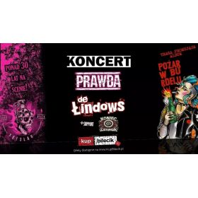 gościnnie zagra z nami zespół Koniec Listopada  Bilety do nabycia na:  KupBilecik.plDe Łindows & Prawda artyści: De Łindows, Prawda Prawda założona latem 1994 roku przez Skutera i Melona. Swój debiutancki materiał, „Biologia z drugiej strony” zarejestrowała w grudniu 1994 roku. Przez ponad dwadzieścia lat funkcjonowania zespół nagrał sześć regularnych albumów, kilka ep-ek, album kompilacyjny wydany w Czechach a ich utwory znalazły się na wielu składankach. De Łindows powstał w Katowicach w 2002r. Mają za sobą koncerty w Polsce, Czechach i na Słowacji. Występowali m.in. na takich festiwalach jak: - Przystanek Woodstock/Pol"and"Rock Festival (zagrali tam trzykrotnie - Scena Viva Kultura), Jarocin, Punk Island (SK), Underground Fest (SK), Keltska Noc (CZ) dwukrotnie, Czad Festiwal gdzie zagrali obok min. The Offspring i Billy Tallent, Around The Rock, Przystanek Żory (Nagroda publiczności) Festiwal Izerbejdzan, goście tras Punky Regge Live, Zew się Budzi, Czochraj Bobra Fest Bilety do nabycia na:  KupBilecik.pl     |