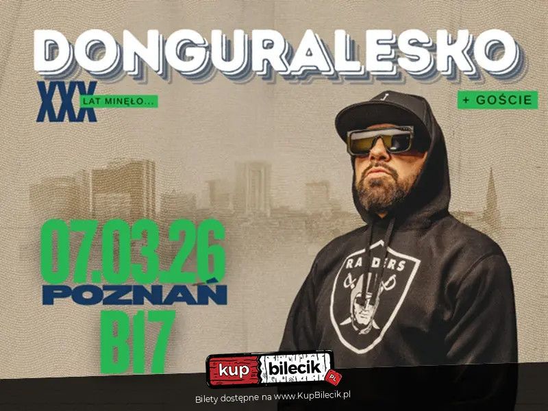 bilety: 30 lat minęło, dziadzia ciągle... w formie, w ogniu i na scenie - dlatego już 7 marca w poznańskim klubie B17 świętujemy absolutnie wyjątkowy, jedyny w swoim rodzaju koncert 30-lecia DGE. Trzy dekady na majku, trzy dekady stylu, który wjechał do polskiego rapu jak husaria na turbo - i dalej jedzie jak złoto. Legenda wraca do domu, a dom szykuje się na głośny jubileusz. Bilety? Warto mieć wcześniej, bo to nie jest zwykły koncert - to celebracja trzech dekad kultury, flow i nieśmiertelnej "gibkiej fali". Do zobaczenia pod sceną! Informacje organizacyjne: - osoby poniżej 18. roku życia muszą posiadać pisemną zgodę opiekuna prawnego. - podane godziny są orientacyjne i mogą ulec zmianie. Bilety do nabycia na: KupBilecik.pldonGURALesko artyści: Piotr GórnydonGURALesko, właściwie Piotr Górny, znany również jako Gural, DGE, DJ Dziadzior, Giovanni Dziadzia, Osieroconych Płyt Selektor. Działa na polskiej scenie hip-hopowej od 1995 roku i jest członkiem takich grup muzycznych jak Killaz Group, Super Grupa, K.A.S.T.A., PDG Kartel oraz GTW. donGURALesko współpracował z takimi wykonawcami jak Tede, Sido, DJ Kostek, Matheo, Paluch, Miodu, Waldemar Kasta, VNM, Wdowa, Brahu, Pih, Rafi, Shellerini, Fokus, Grubson, Pezet czy Kasia Klich. Dyskografia: Opowieści z betonowego lasu • Data: grudzień 2002 • Wydawca: Blend Records Drewnianej małpy rock • Data: 14 lutego 2005 • Wydawca: Wielkie Joł El Polako • Data: 23 czerwca 2008 • Wydawca: 5 Element Totem leśnych ludzi • Data: 11 czerwca 2010 • Wydawca: Szpadyzor Records Zaklinacz deszczu • Data: 26 listopada 2011 • Wydawca: Szpadyzor Records Projekt jeden z życia moment • Data: 15 listopada 2012 • Wydawca: Szpadyzor Records Kroniki betonowego lasu • Data: 30 czerwca 2014[38] • Wydawca: Szpadyzor Records Magnum Ignotum preludium • Data: 20 listopada 2015 • Wydawca: Szpadyzor Records donGURALesko prowadzi także własną firmę odzieżową EL POLAKO oraz telewizje internetową DziadziorTV, w ramach której tworzony jest popularny program FOLLOW THE RABBIT TV, będący, jak mówi sam Gural wentylem bezpieczeństwa, spuszczającym ciśnienie z nadętej "rap branży". Bilety do nabycia na: KupBilecik.pl |