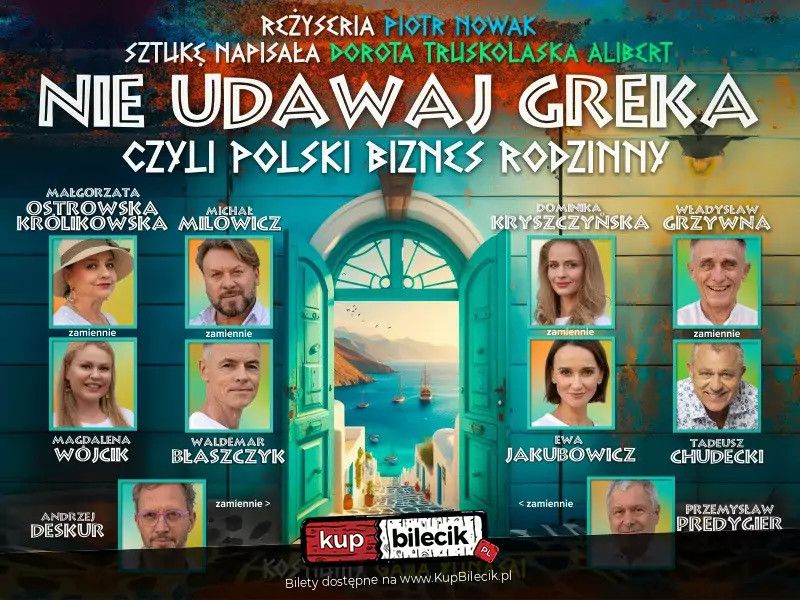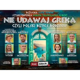 bilety: Nie udawaj Greka, czyli polski biznes rodzinny. Przebojowa, rozpalona greckim słońcem komedia, która rozpieszcza widzów wybornym humorem, wartkim tempem, zaskakującymi zwrotami akcji oraz smakowitą grą aktorską. Nie udawaj Greka artyści: Małgorzata Królikowska, Waldemar Błaszczyk, Magdalena Wójcik, Michał Milowicz i inniZapraszamy do Grecji, gdzie Anna i Bogumił spełniają swoje marzenie o otworzeniu greckiej knajpki z dala od polskiej biurokracji i nadmiaru zbędnych formalności. W początkach biznesu nigdy nie jest łatwo, a tu na dodatek pojawia się prosto z Warszawy, z urzędową kontrolą, Inspektor. Męcz się Polaku do końca swoich dni, bo nawet kiedy mieszkasz na końcu świata to i tak cię dopadną! Do pomocy właścicielom w ratowaniu knajpki dołączają Beatka i Andrzej, z zapałem wikłając Inspektora w nie do końca przemyślaną intrygę, która wymyka się spod kontroli i prowadzi do nieuniknionej katastrofy. Ten spektakl trzeba zobaczyć! Bilety do nabycia na: KupBilecik.pl |
