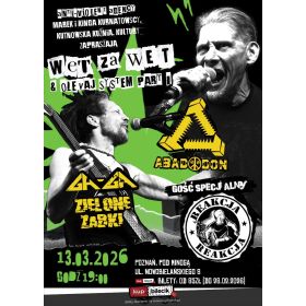 bilety: ABADDON - zespół powstał w 1982 w Bydgoszczy, założony przez: wokalistę "Wolfa", gitarzystę Bernarda "Benka" Szarafińskiego, basistę Tomasza "Lutka" Frosta i perkusistę Tomasza "Perełkę" Dorna. Początkowo używał nazwy "Partyzantka Miejska". Szerszej publiczności zaprezentował się (już jako Abaddon) podczas festiwalu w Jarocinie w 1983 roku. Niedługo potem doszło do zmiany wokalisty: "Wolfa" zastąpił dotychczasowy menedżer zespołu Waldek "Kiki" Jędyczowski. W tym składzie Abaddon grał do 1987, występując m.in. w kolejnych edycjach Jarocina (1984-1985) i "Róbrege". W 1985 na poltonowskiej składance Fala pojawił się utwór "Kto?". W tym czasie na jednym ze swoich koncertów muzycy poznali Petera Barbarića dziennikarza jugosłowiańskiej gazety "Mladina". Barbarić zaprosił zespół do Jugosławii na występy. Na przełomie wiosny i lata Abaddon zagrał tam minitrasę składającą się z sześciu koncertów w różnych miastach (dwa razy w Lublanie, raz w Zagrzebiu, Belgradzie i w Izoli). Honoraria za występy członkowie zespołu przeznaczyli na nagranie materiału w lublańskim studiu. Nagrany album zatytułowany Wet za wet ukazał się w 1986 nakładem francuskiego wydawnictwa New Wave Records. W Polsce płyta została wydana dopiero w 1991 roku, tymczasem na składance Jak punk to punk pojawiły się dwa utwory z tej sesji ("Wet za wet" i "Kto?"). W 1987 wskutek rozłamu w zespole nastąpił jego koniec. Tomasz Dorn kontynuował granie od 1989 roku w zespole Variété, natomiast Tomasz Frost w latach 1998-2001 był menedżerem toruńskiego zespołu Rejestracja. W 2001 Waldek "Kiki" Jędyczowski i Tomasz Dorn reaktywowali Abaddona z nowymi muzykami: Robertem "Zwierzakiem" Dembczyńskim (gitara) i Władkiem Reflingiem (gitara basowa). Pierwszy koncert po kilkunastoletniej zagrali 1 czerwca w bydgoskim klubie "Wiatraczek". Później były koncerty w całej Polsce (m.in. z Dezerterem), a także w Berlinie i w Wiedniu. W sierpniu 2003 roku zespół zagrał mini-trasę po Stanach Zjednoczonych występując m.in. w nowojorskim klubie "CBGB". W 2004 ukazał się drugi album Abaddona zatytułowany Godzina krzywd. W kwietniu 2005 roku muzycy ponownie zawiesili działalność. W kwietniu 2017 roku zespół wznowił działalność z Piotrem "Bolo" Boleskim na basie i z okazji XXXV lecia działalności zaplanowano koncerty. Wet Za Wet & Olevaj System artyści: Abaddon, Ga-Ga Zielone Żabki + gościeABADDON - zespół powstał w 1982 w Bydgoszczy, założony przez: wokalistę "Wolfa", gitarzystę Bernarda "Benka" Szarafińskiego, basistę Tomasza "Lutka" Frosta i perkusistę Tomasza "Perełkę" Dorna. Początkowo używał nazwy "Partyzantka Miejska". Szerszej publiczności zaprezentował się (już jako Abaddon) podczas festiwalu w Jarocinie w 1983 roku. ZIELONE ŻABKI i GA-GA to dwa zespoły które na przełomie lat 80 i 90 namieszały sporo w polskiej, niezależnej, scenie muzycznej, głównie za sprawą Festiwalu w Jarocinie. Ich muzyka przetrwała lata, a teksty pisane wtedy, zaskakują aktualnością. Bilety do nabycia na: KupBilecik.pl |